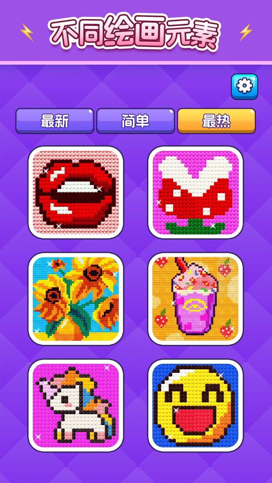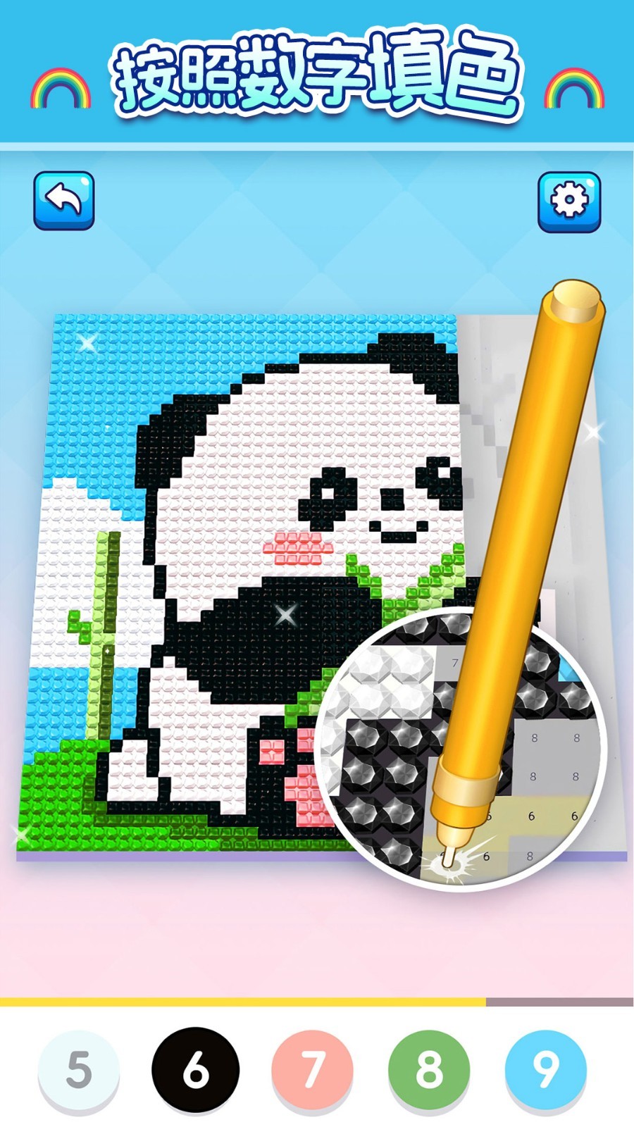 1、独特像素艺术风格融合宝石镶嵌工艺,超过500个精心设计的数字图案从简单到复杂循序渐进,每完成一个区域都会产生璀璨的宝石反光效果。